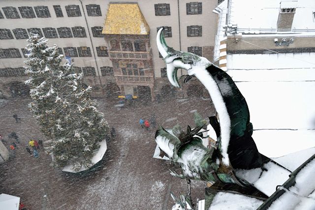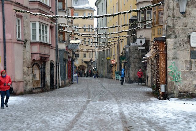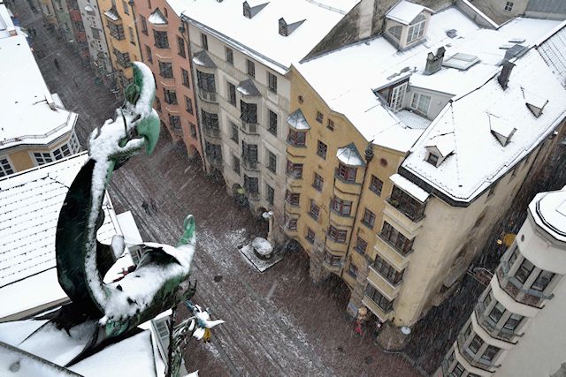 | Целый час поезд бодро вез нас, однако в Иннсбруке все закончилось. Отправление откладывалось на полчаса, потом еще на полчаса, еще на час, ну и потом совсем как-то отменилось, и мы поняли, что прорываться дальше в Зальцбург уже бессмысленно. Иннсбрук, конечно, интересный город, но это было уже третье его посещение, да и погода была весьма слякотная |