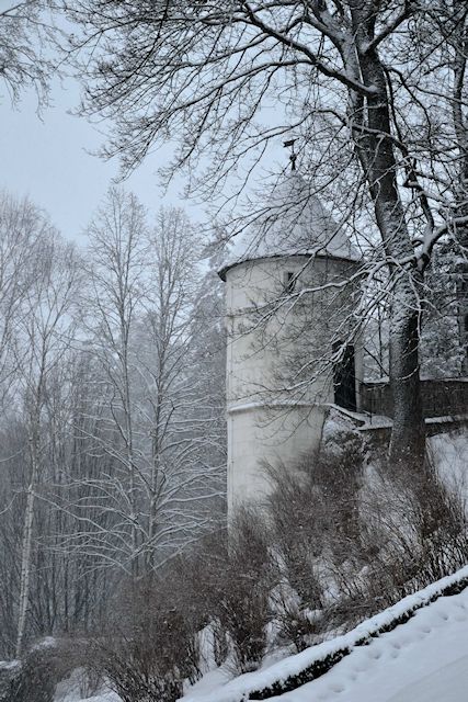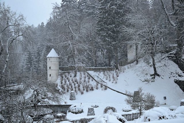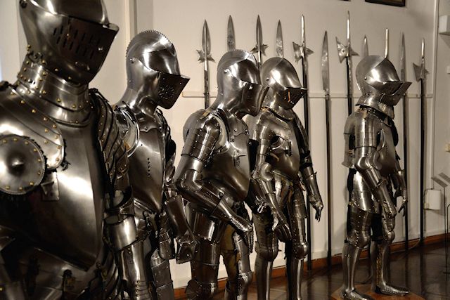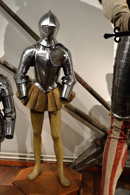 | Замок состоит из нескольких строений. В первом находятся коллекции оружия, а главное, доспехов. На этом снимке - турнирные доспехи со специальными "держалками" для копья, так как копья, которыми сражались на турнирах больше были похожи на немаленькие такие бревна... |