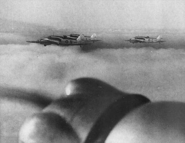 Anson pilot’s view, over the starboard Cheetah radial, of three other 48 Sqn Ansons flying from RAF Manston in October 1936.