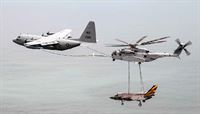 Регистрационный номер: CF-01 Вертолет CH-53K, несущий на внешней подвеске истребитель F-35, выполняет дозаправку топливом в полете