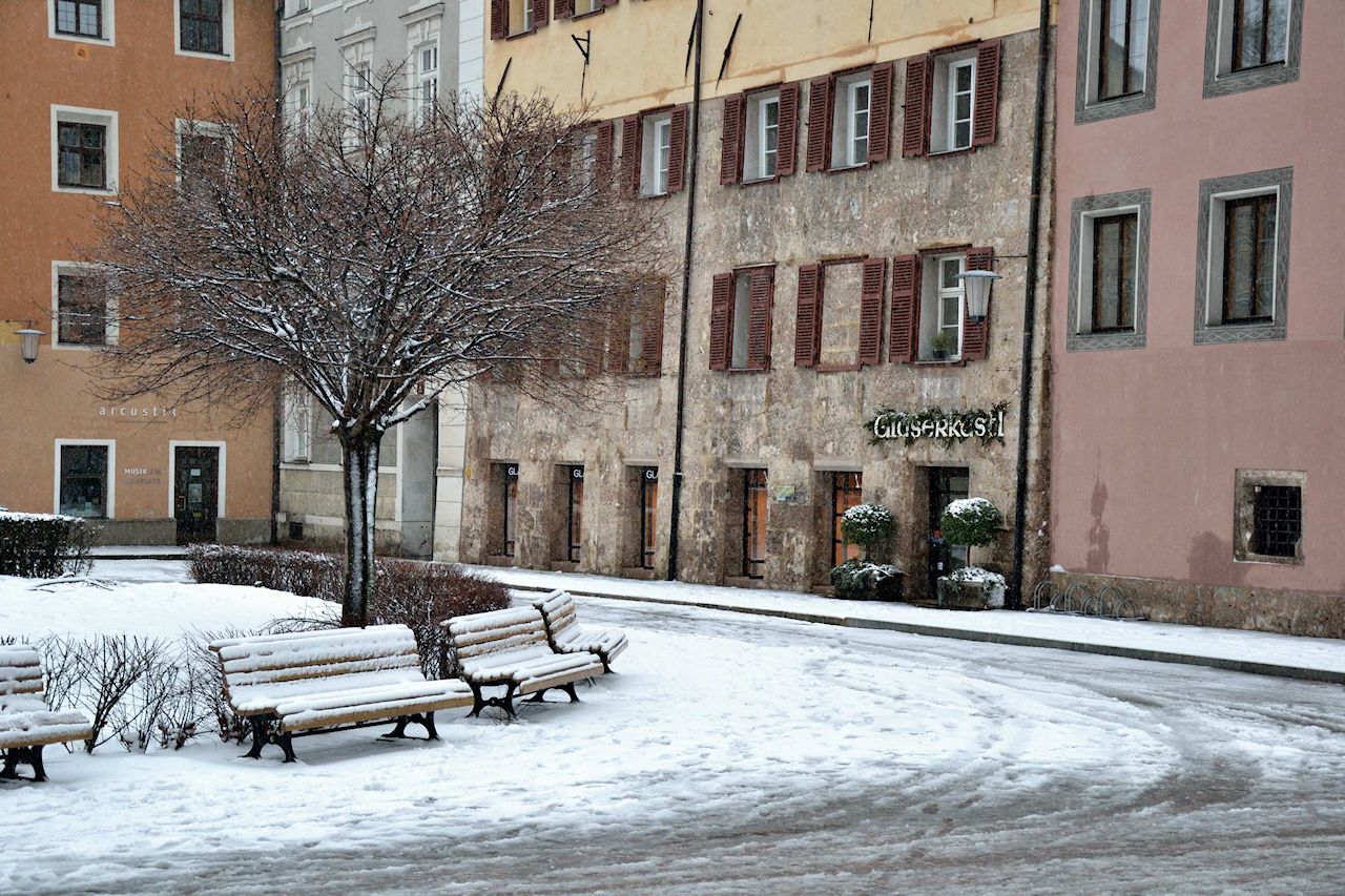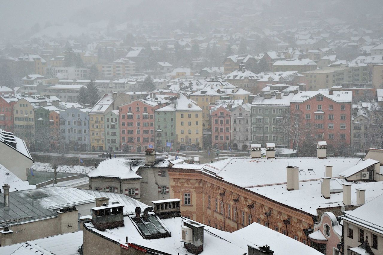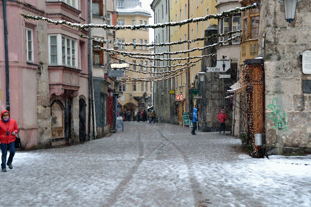 | Целый час поезд бодро вез нас, однако в Иннсбруке все закончилось. Отправление откладывалось на полчаса, потом еще на полчаса, еще на час, ну и потом совсем как-то отменилось, и мы поняли, что прорываться дальше в Зальцбург уже бессмысленно. Иннсбрук, конечно, интересный город, но это было уже третье его посещение, да и погода была весьма слякотная |