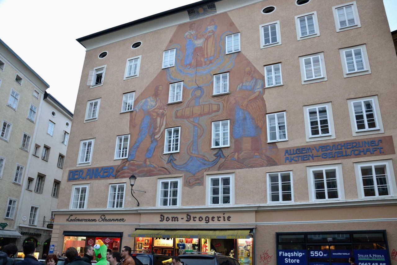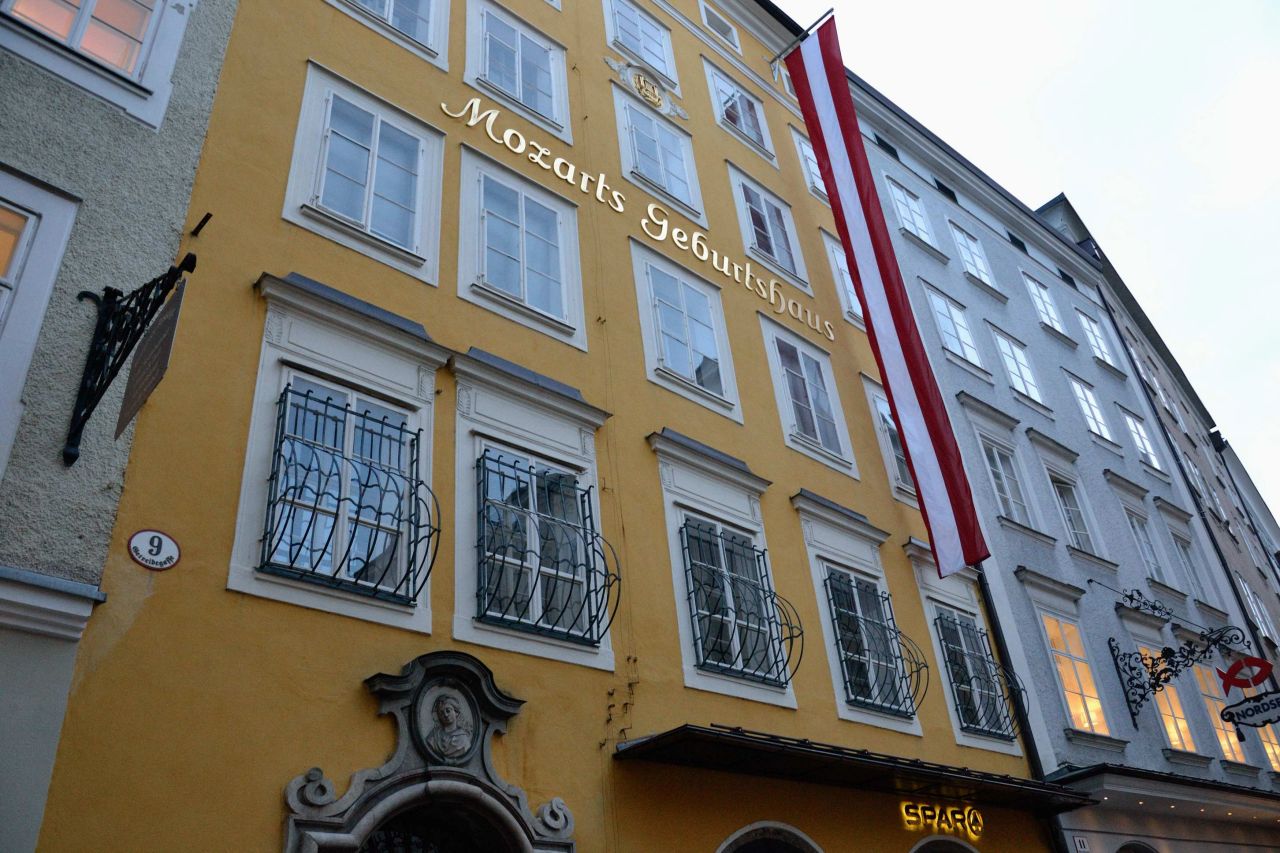 | Дом, в котором родился Моцарт в паре сотен метров от площади Моцарта. Наверху - музей-квартира, внизу - супермаркет |