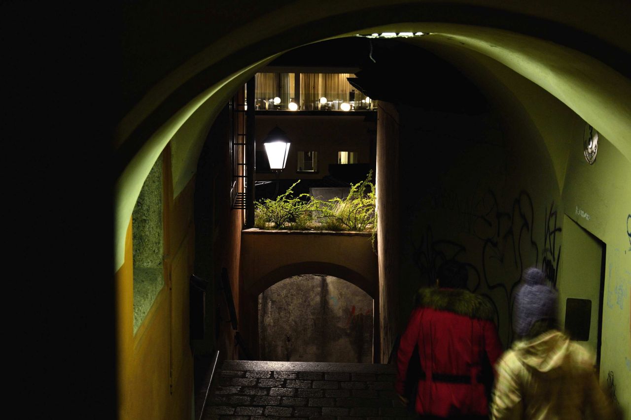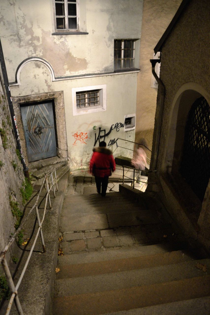 | Уже в темноте переходим реку и поднимаемся к монастырю Капуцинов по узкой лестнице |