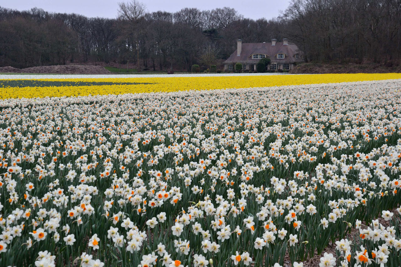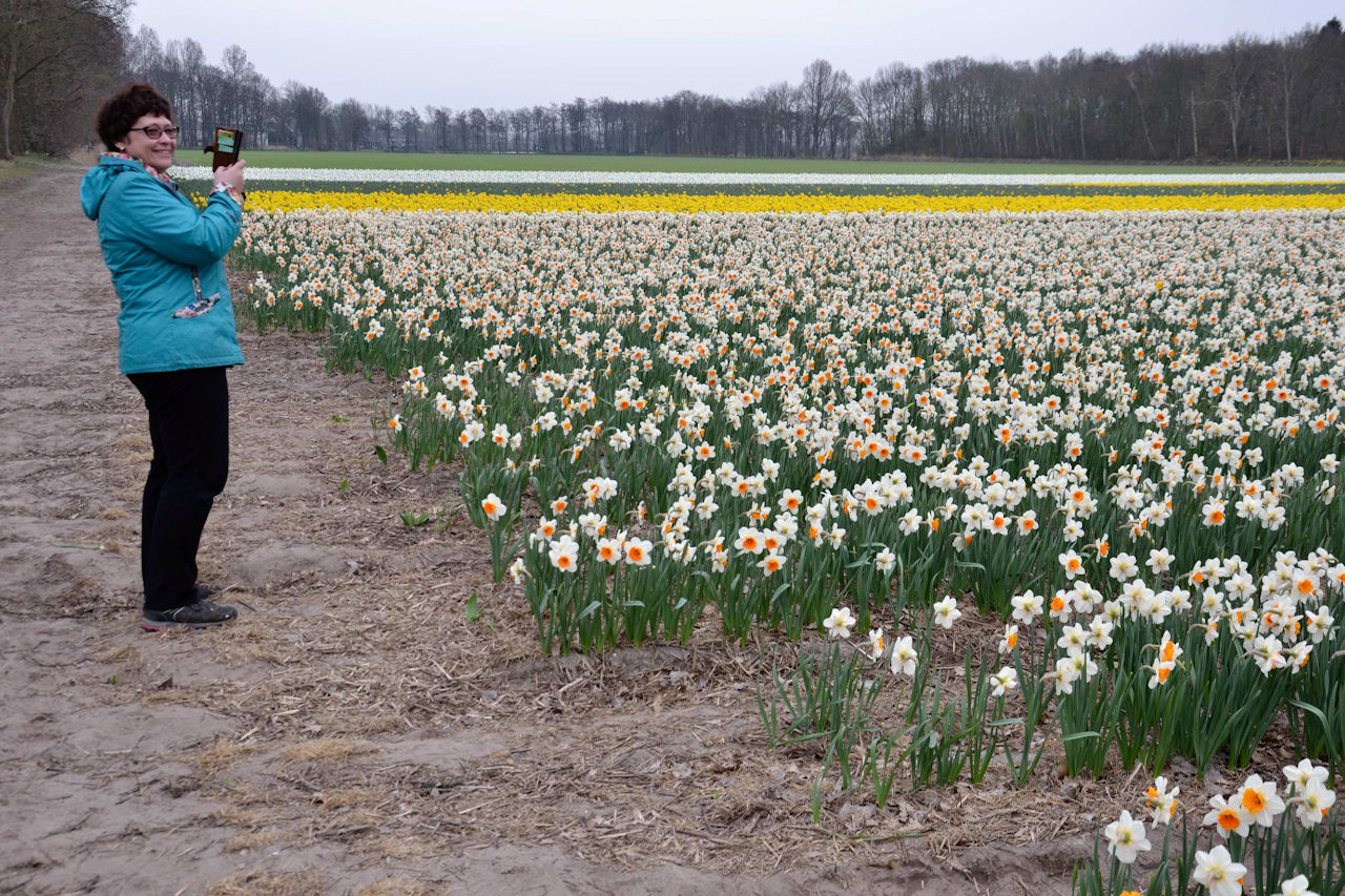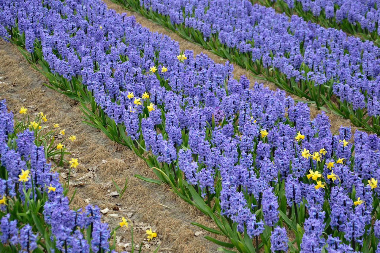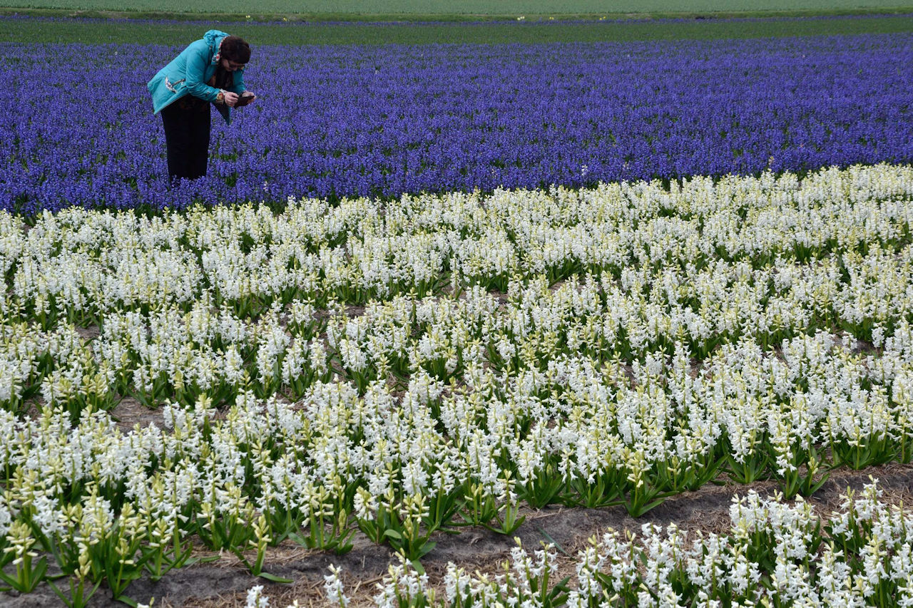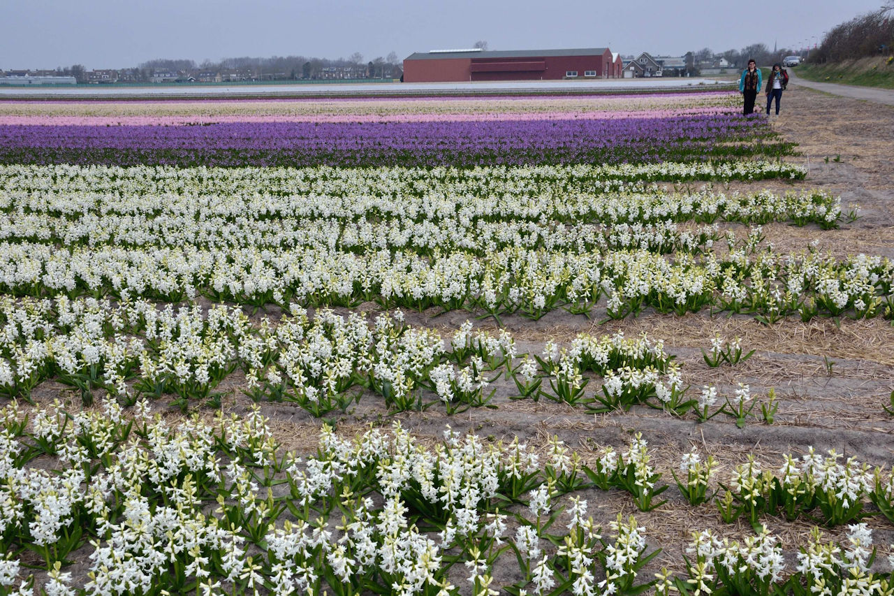 | На следующий день за завтраком мы расспросили хозяина домика о тюльпанах. Оказалось, что весна была холодной, тюльпаны еще не распустились, и ими можно полюбоваться только в крытых павильонах Кёкенхофа. Но кроме тюльпанов есть еще нарциссы и гиацинты. И действительно, по пути к Кёкенхофу обнаружилось немало цветущих полей. Цветы росли прямо на грядках, как картошка. |