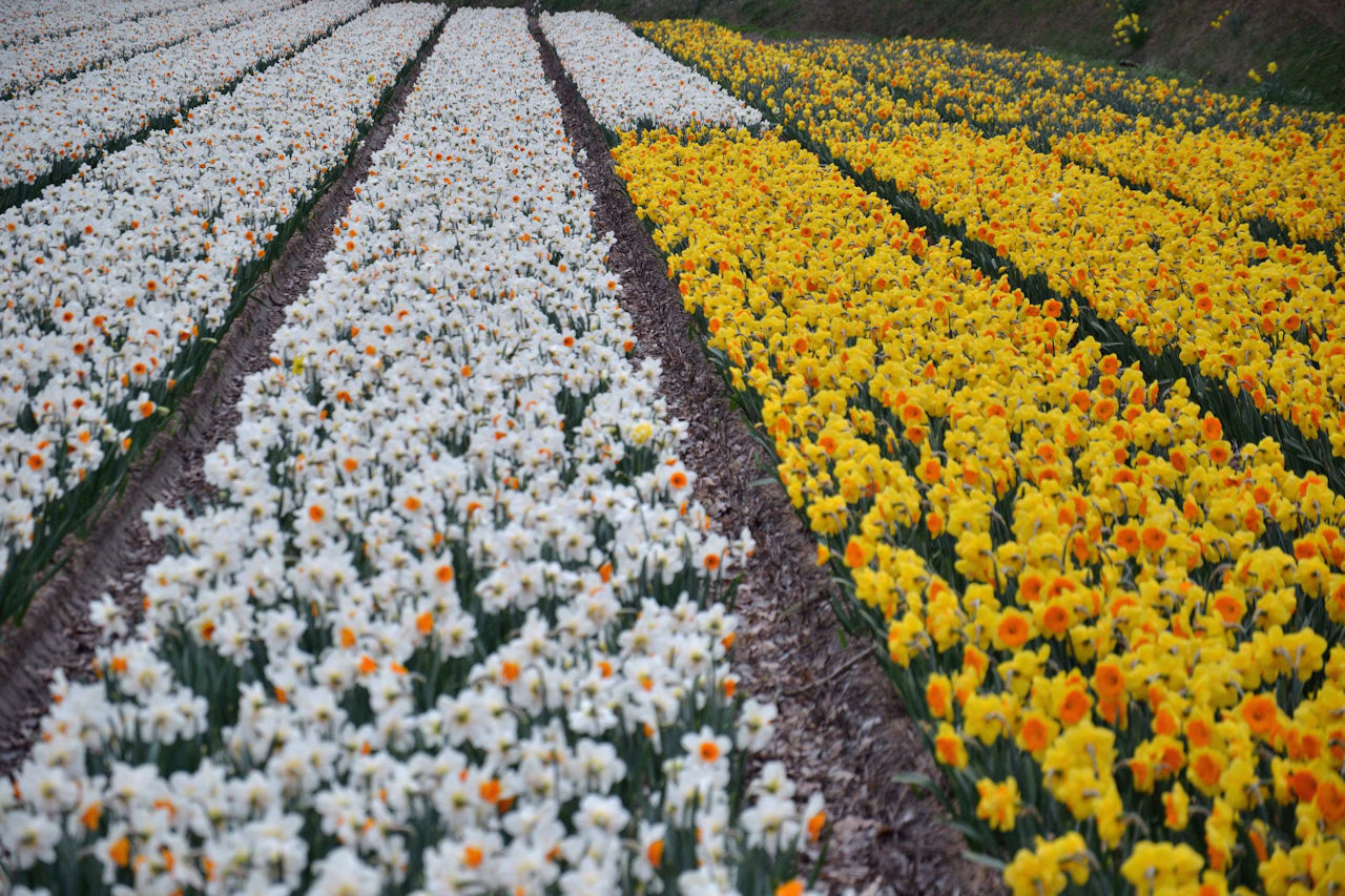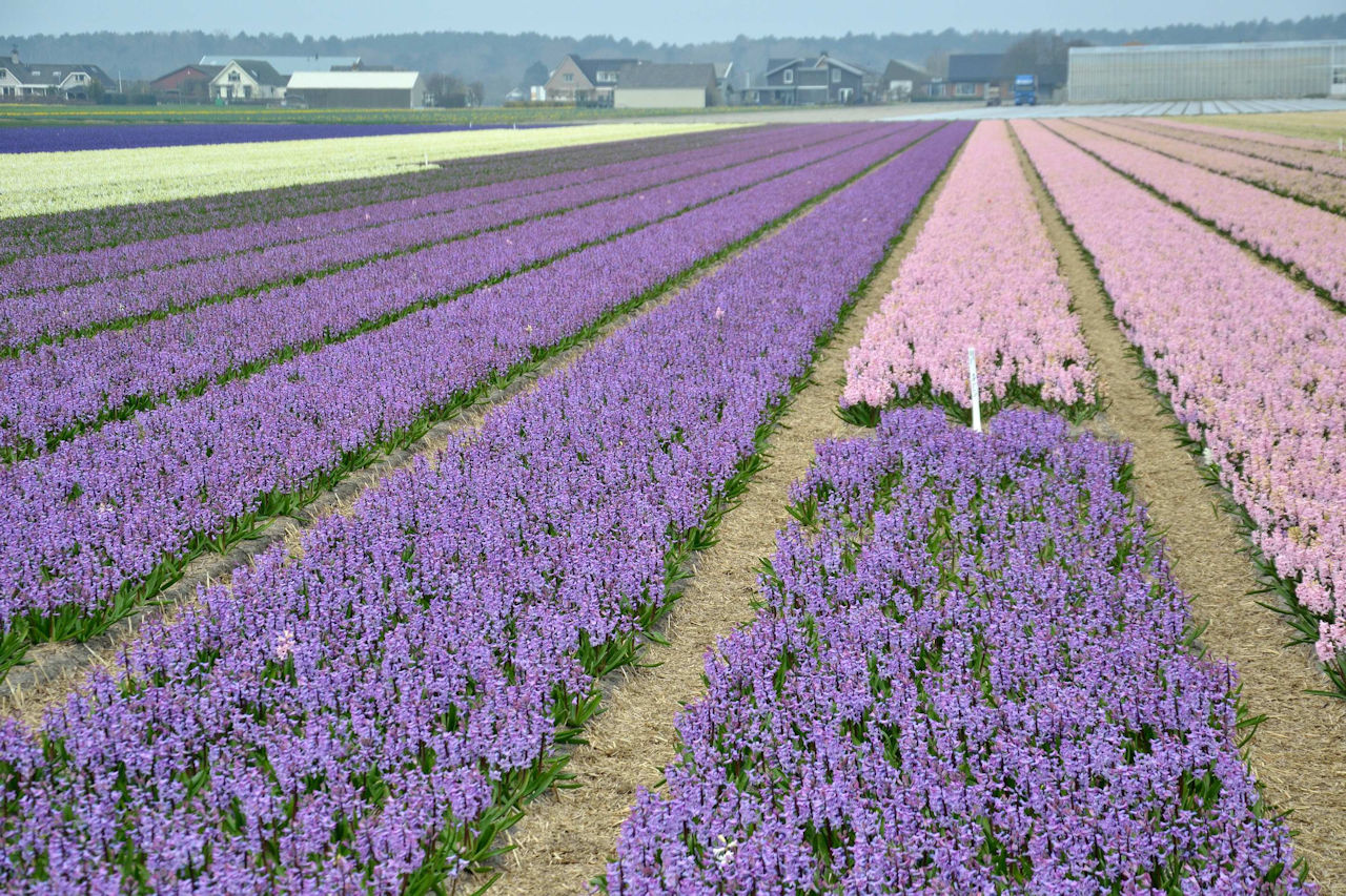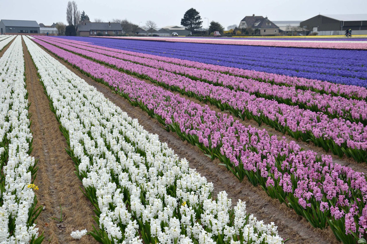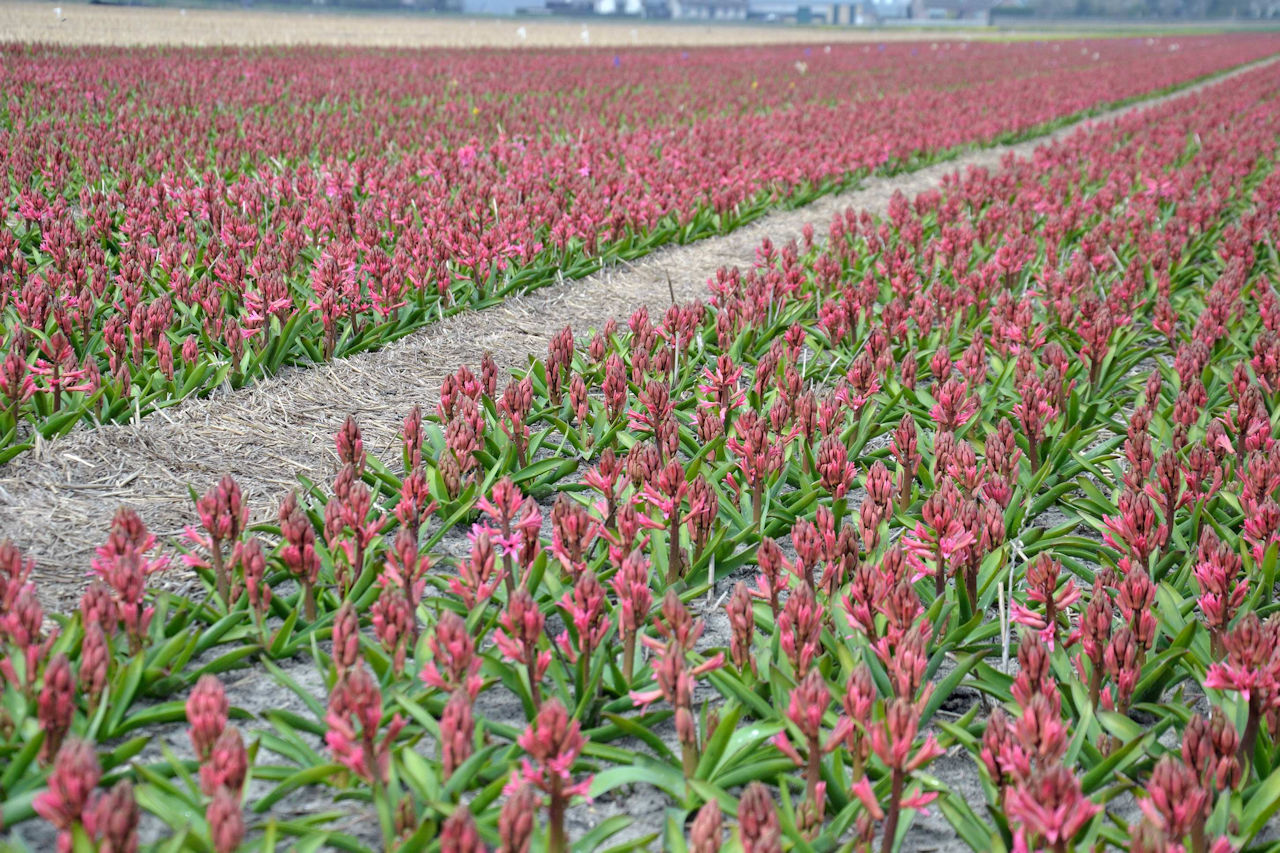 | На следующий день за завтраком мы расспросили хозяина домика о тюльпанах. Оказалось, что весна была холодной, тюльпаны еще не распустились, и ими можно полюбоваться только в крытых павильонах Кёкенхофа. Но кроме тюльпанов есть еще нарциссы и гиацинты. И действительно, по пути к Кёкенхофу обнаружилось немало цветущих полей. Цветы росли прямо на грядках, как картошка. |