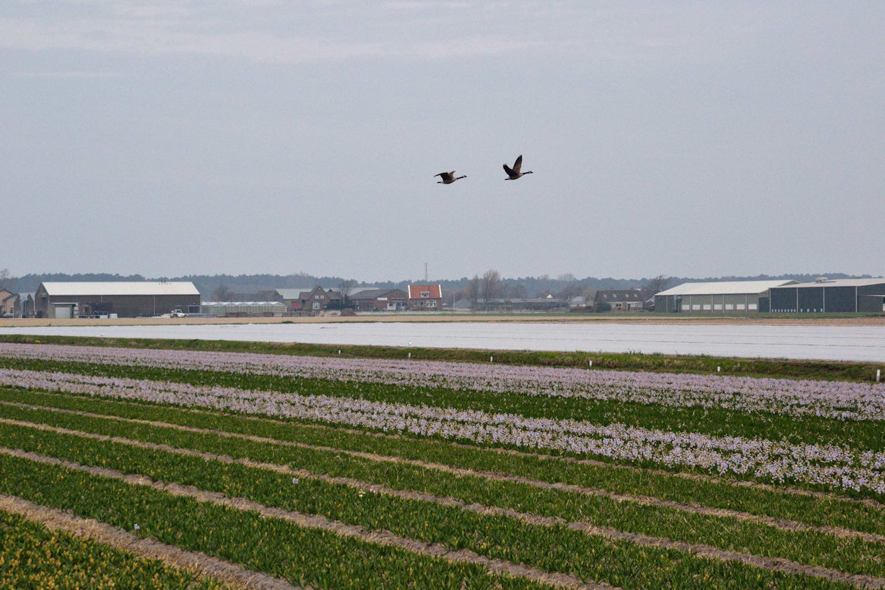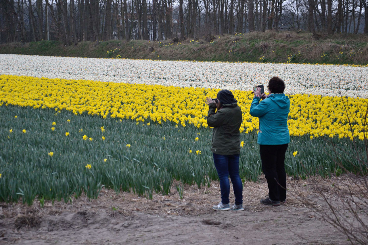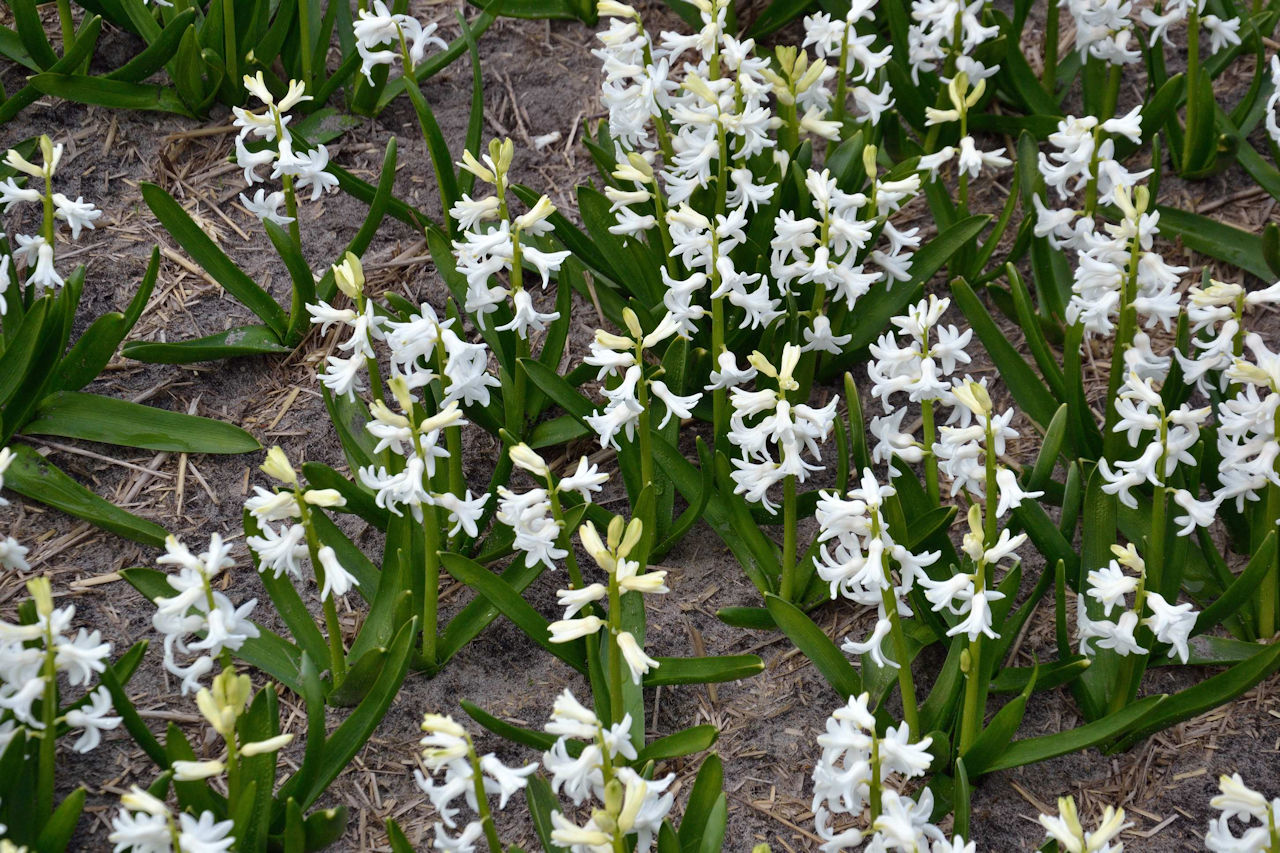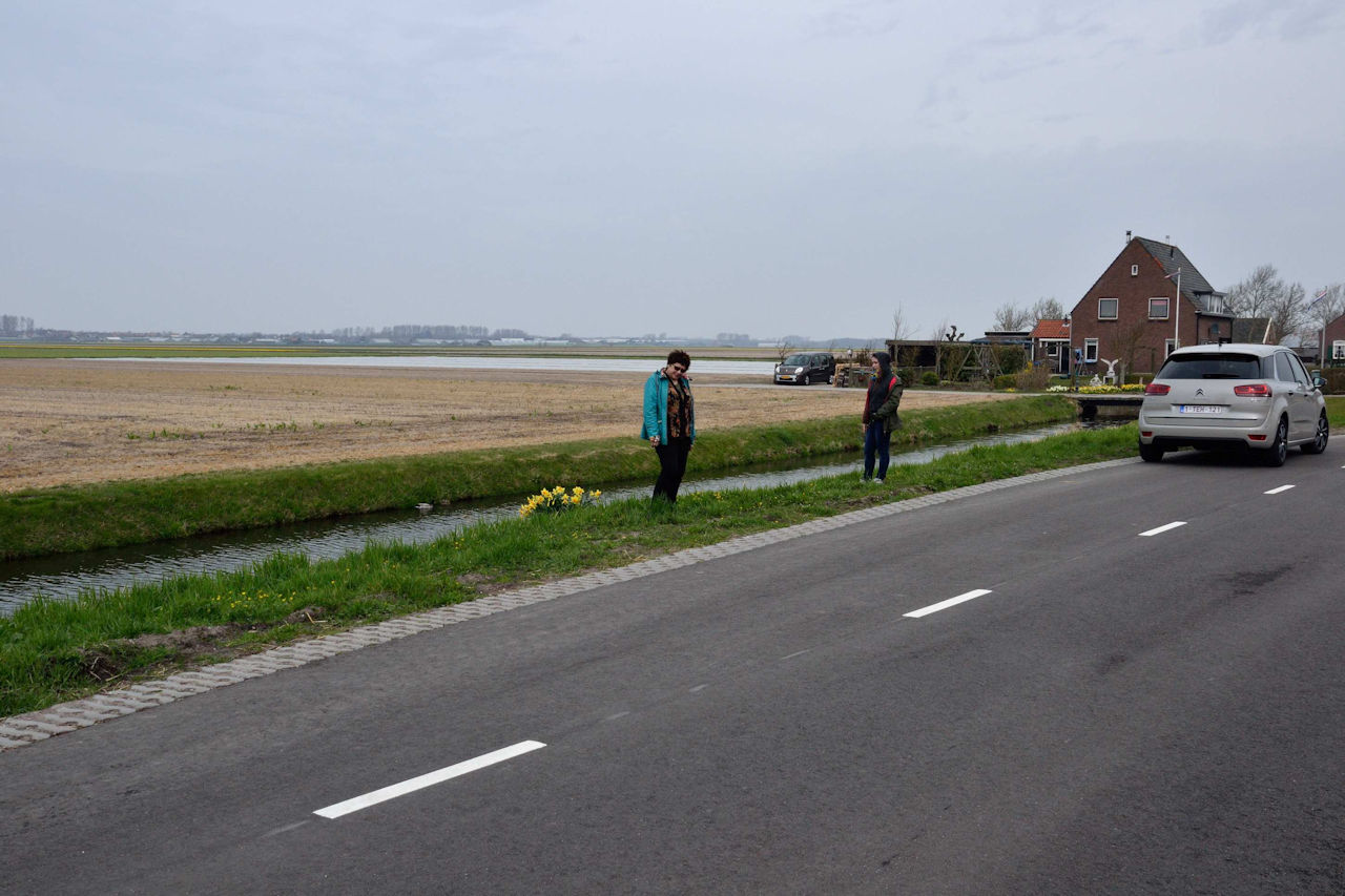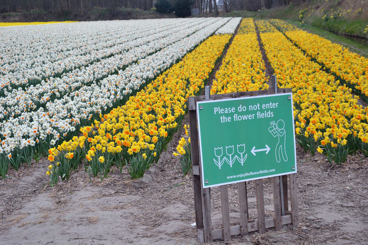 | На следующий день за завтраком мы расспросили хозяина домика о тюльпанах. Оказалось, что весна была холодной, тюльпаны еще не распустились, и ими можно полюбоваться только в крытых павильонах Кёкенхофа. Но кроме тюльпанов есть еще нарциссы и гиацинты. И действительно, по пути к Кёкенхофу обнаружилось немало цветущих полей. Цветы росли прямо на грядках, как картошка. |