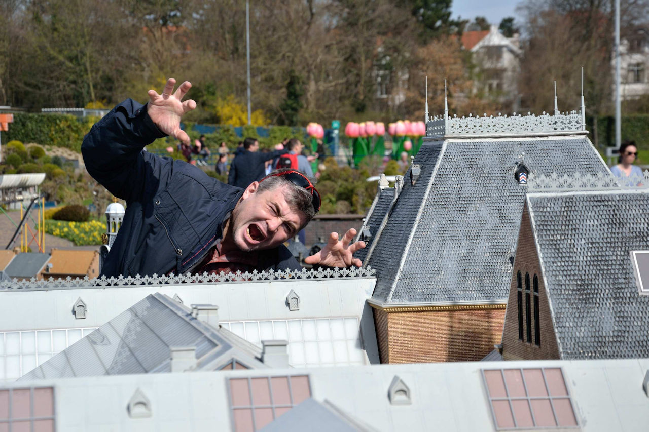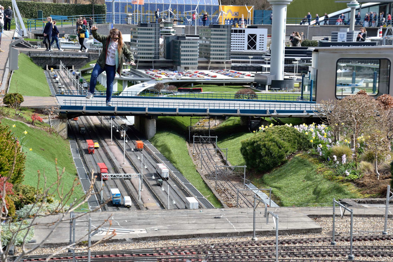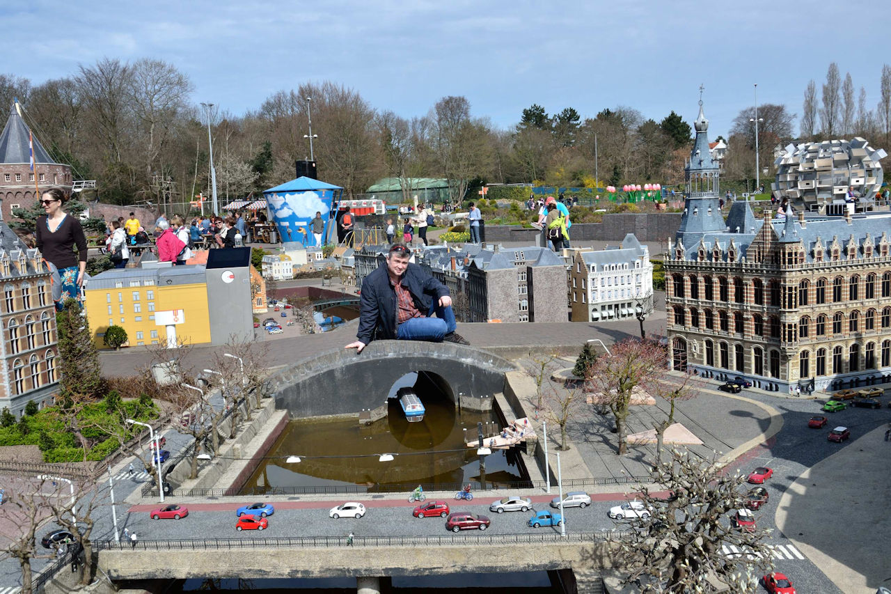 | На следующий день мы поехали смотреть макет Голландии - "Мадуродам". На входе макет рабочего в натуральную величину затыкал пальцем макет дырки в макете дамбы. |