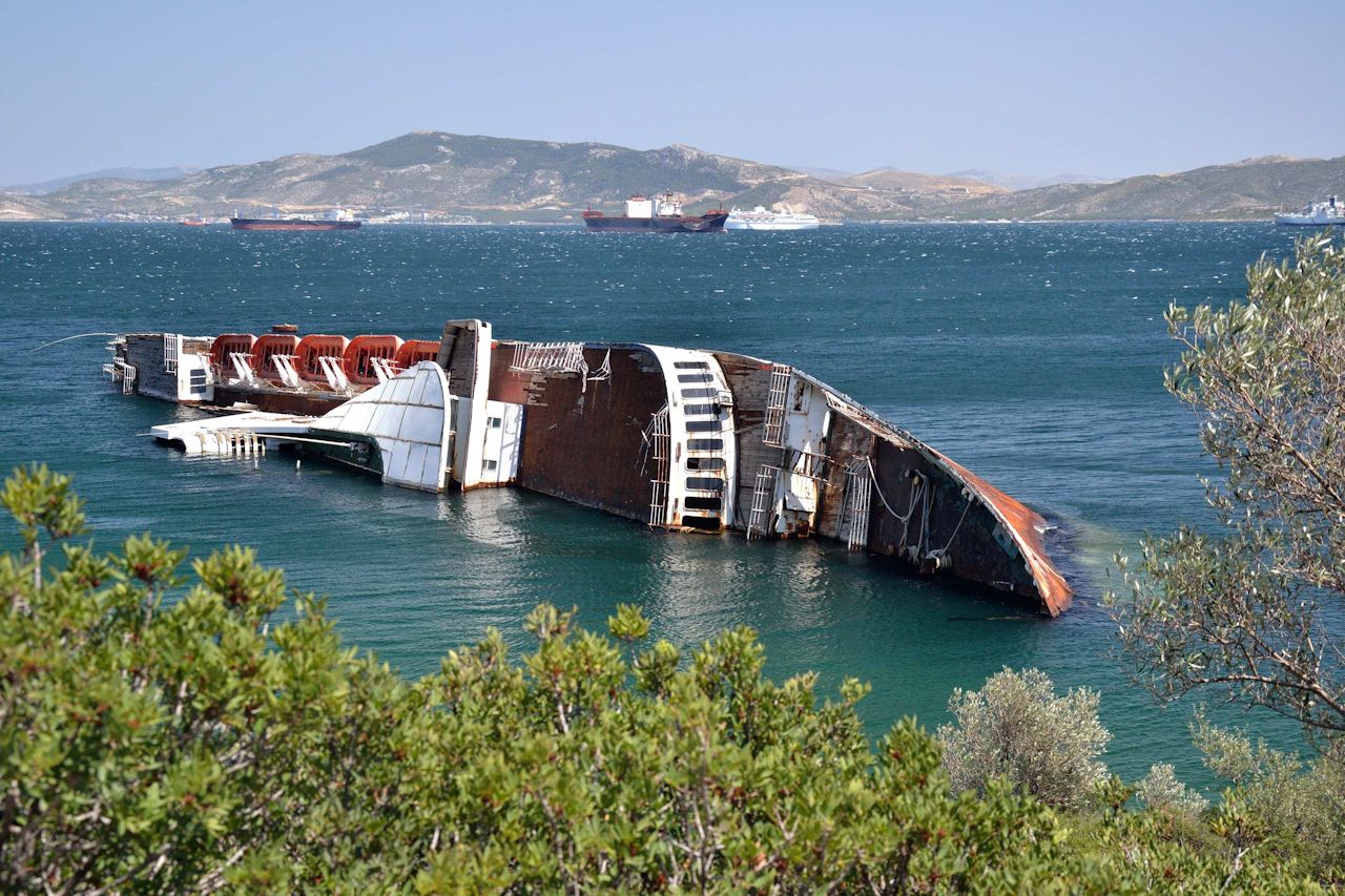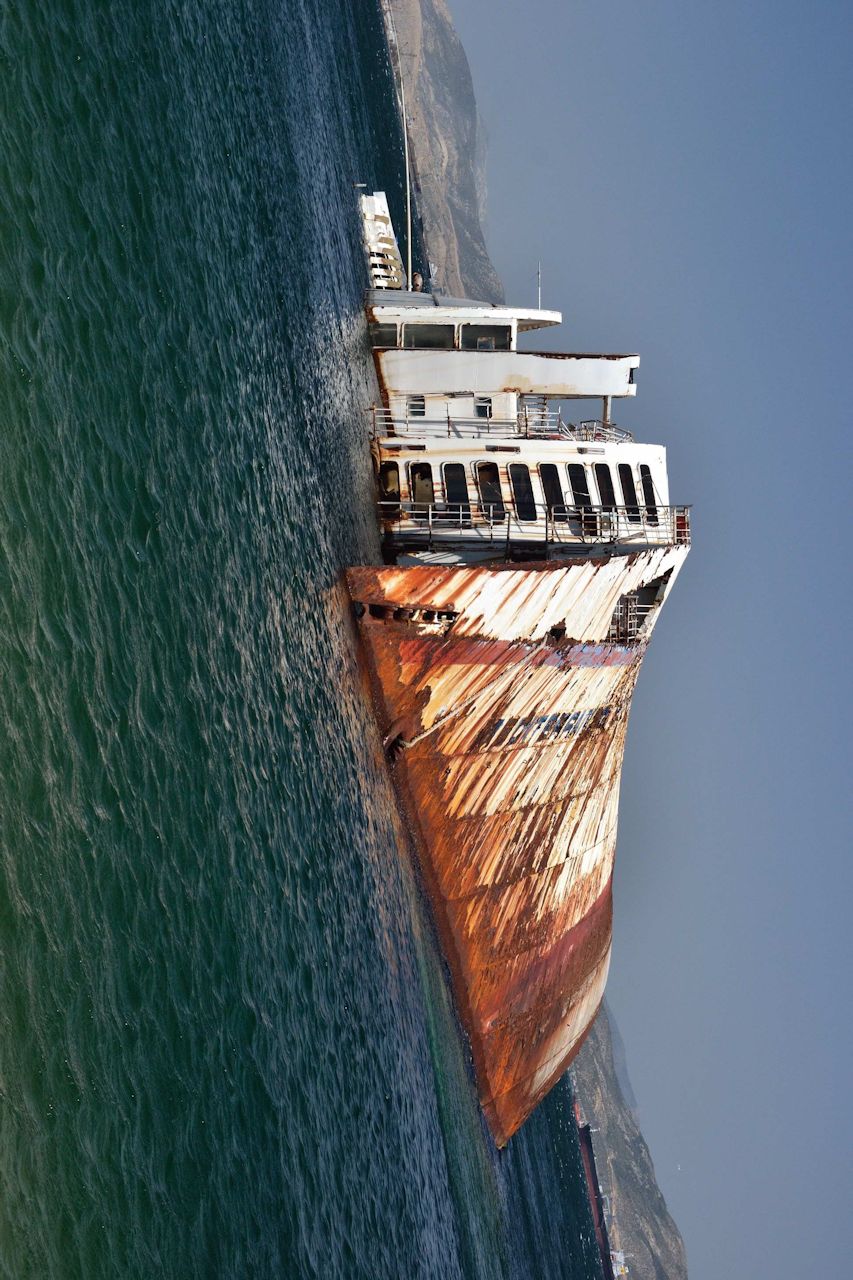 | Первое интересное место по пути на запад встретилось уже через пару-тройку десятков километров. Изящный пассажирский лайнер валялся на боку недалеко от берега. С трудом можно было прочитать название - Mediterranian Sky. |
