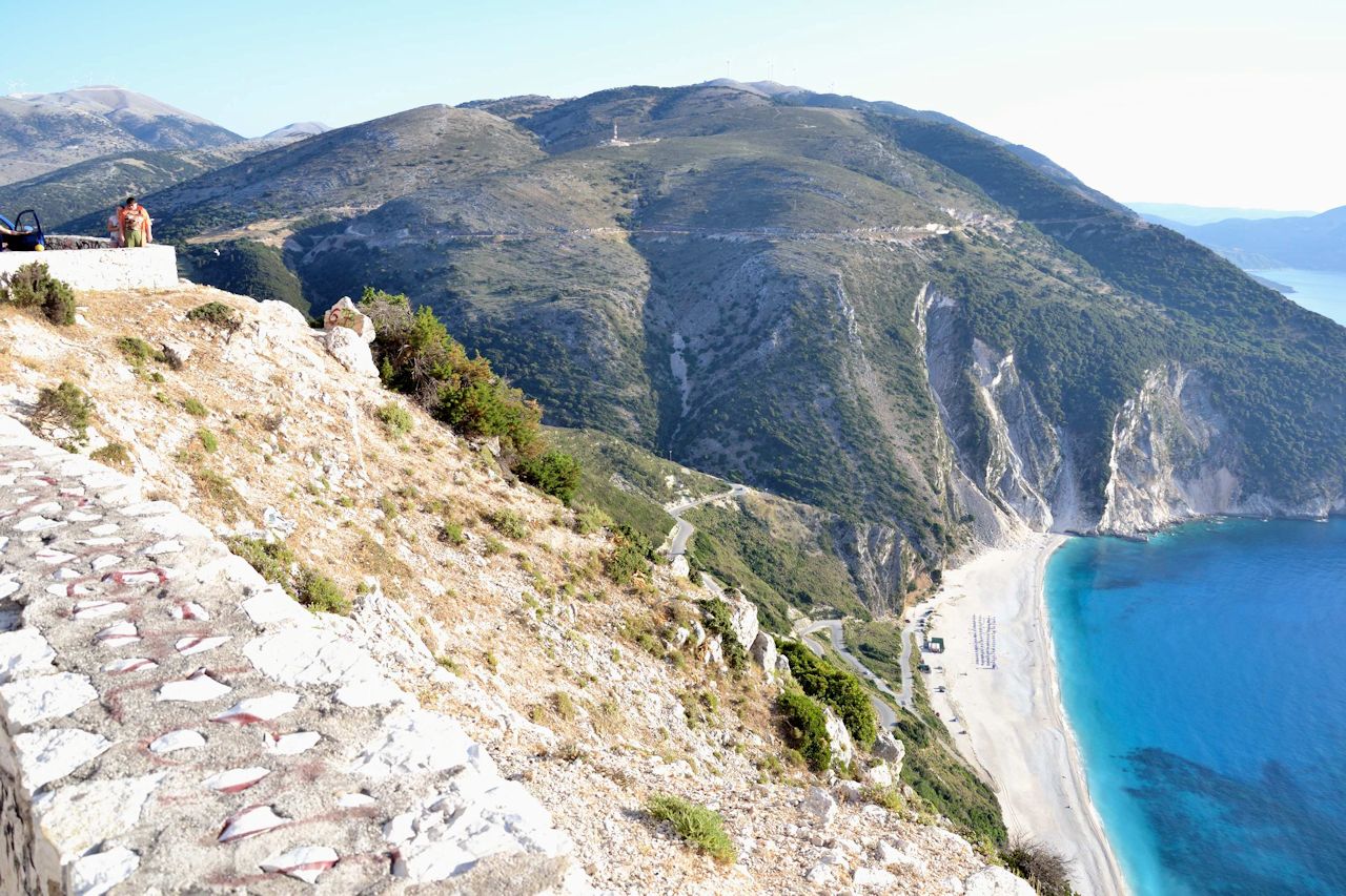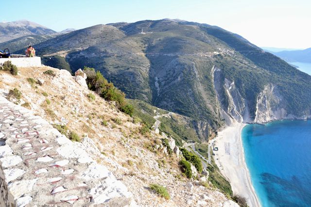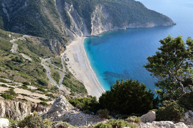 | Самый красивый пляж Кефалонии - Миртос. Белая полоска, зажатая между скал, смотрится очень живописно. К сожалению, это не песок а галька, просто так без коврика не поваляешься. |