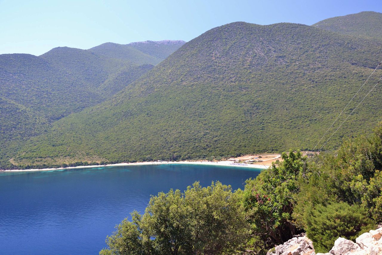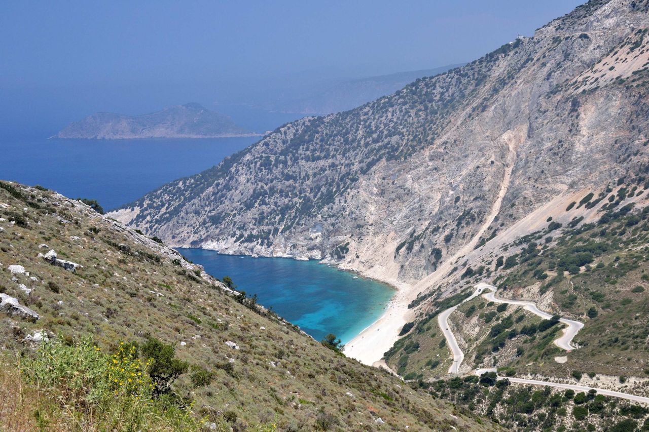 | Вид на пляж Кси от "качающейся скалы" - Коунапетры. Хотя к этому камню ведет множество указателей, качаться он практически перестал после большого землетрясения 1953 года. |
