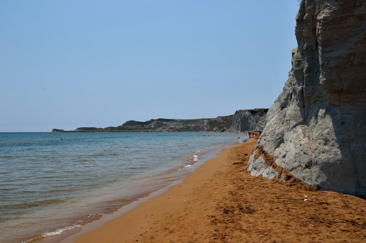 | Пляж Кси характерен мелким рыжим песком и голубыми скалами. |