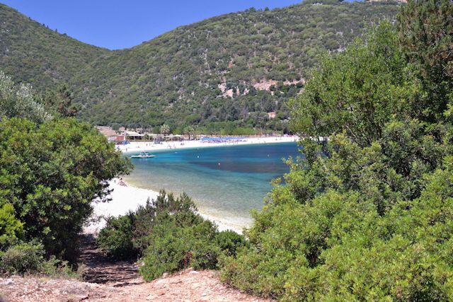 | Недалеко от города Сами, за выступающим мысом, находится пляж Антисамос. Окруженное с трех сторон зеленью, с чистой водой, очень живописное место. Пляж опять же галечный, ведет туда единственная асфальтовая дорога, у самого пляжа спускающаяся крутым серпантином. |
