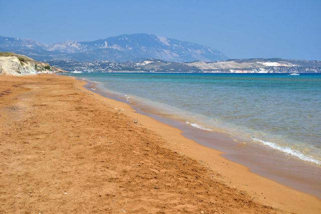 | Пляж Скала (лестница по-гречески) на юго-восточной оконечности острова. Крупный песок и остров Закинтос на горизонте |