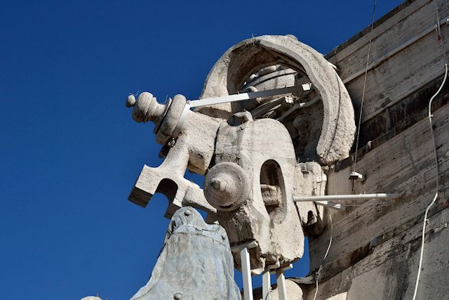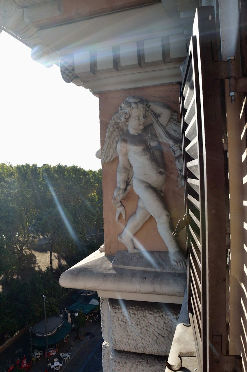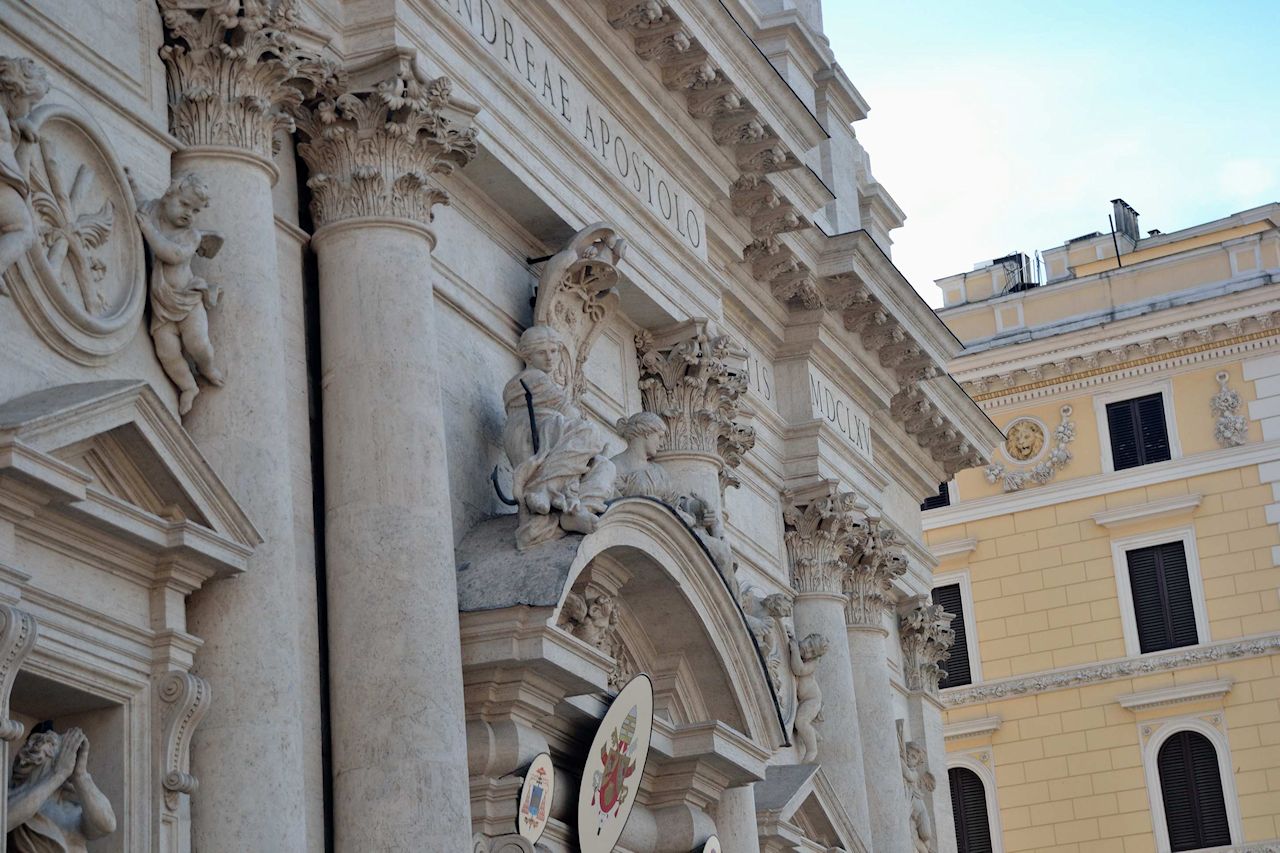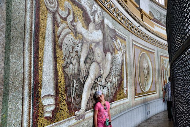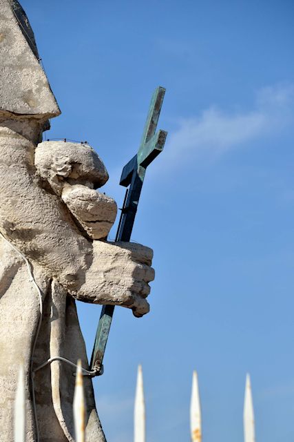 | На полпути вниз площадка с сувенирными магазинами. Оттуда открывается интересный вид на скульптуры, стоящие над фронтоном. Снизу эти фигуры смотрятся совсем по другому... |