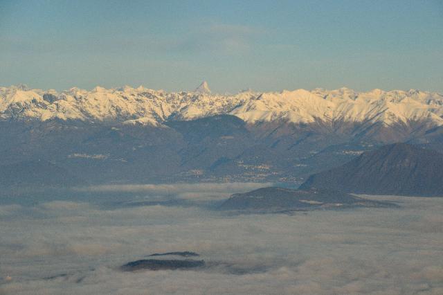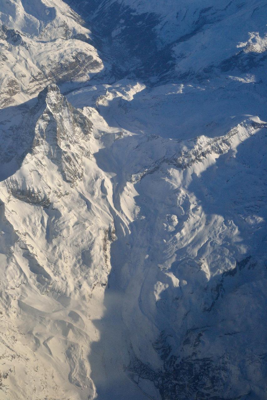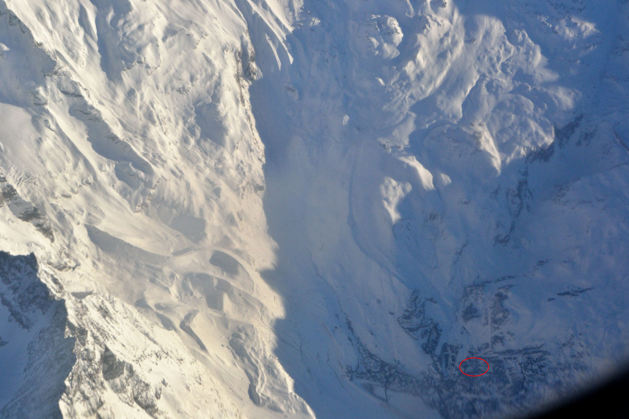 | Неожиданно самолет пролетел прямо над Маттерхорном и местами, по которым мы катались. На фото внизу Червиния, вверху - Церматт |