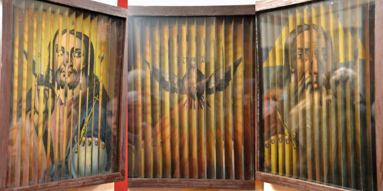 | Даже после ужина нас опять повезли дальше - в городок Холуй, с его лаковыми миниатюрами. До революции миниатюристы были иконописцами, причем весьма своеобразными, с бурной фантазией. Вот, например, Троица - ОДНА икона, при взгляде с разных ракурсов показывающая три различные ипостаси, да еще и с треугольным нимбом. |