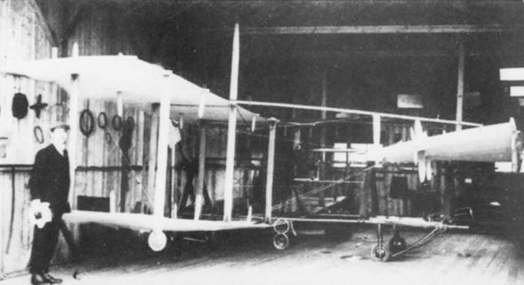 A. V. Roe's original 1907 biplane in its shed at Brooklands. This scene is destined to come to life again.