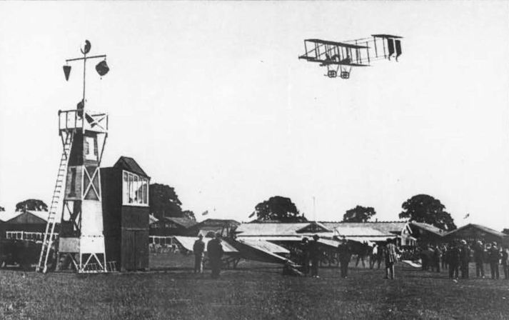 R. J. Lillywhite in a Grahame-White Boxkite on a Hendon race day in June 1914.
