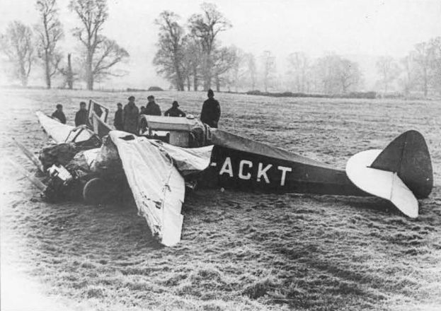 Регистрационный номер: G-ACKT [2] The wrecked Monospar ST-4 G-ACKT lying at Thrupp's Farm at Lidlington, Bedfordshire on December 5, 1933. The Duchess of Bedford's personal pilot, Bernard Allen, was killed.