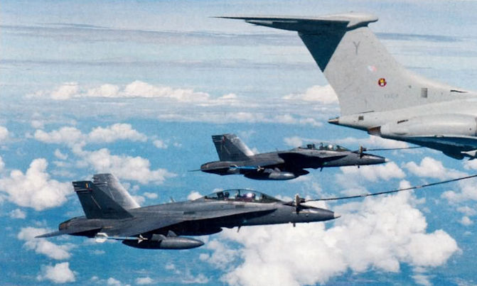 Two Royal Malaysian Air Force F/A-18D Hornets assigned to No.18 Squadron based at Butterworth AB refuel from the RAF VC10.