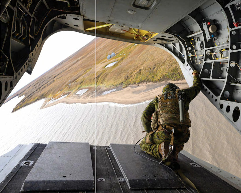 This image is what heavy-lift helicopters are about: the space onboard to lift sizeable loads internally or slung underneath and deliver that quickly to a ground commander. Sgt Gariepy-Levert, the loadmaster of 450 Tactical Helicopter Squadron, RCAF crouches on the the rear ramp of a CH-147F Chinook helicopter flying over the Nicholson Peninsula, Northwest Territories, in September 2023.
