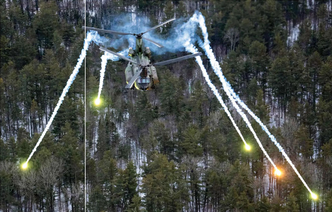 The Chinook is vulnerable over the battlefield and is fitted with a comprehensive self-defence suite. A CH-147F of 450 Tactical Helicopter Squadron, RCAF conduct live door gunner training to qualify students on the C6 machine gun in the training area of Garrison Petawawa, in February 2023