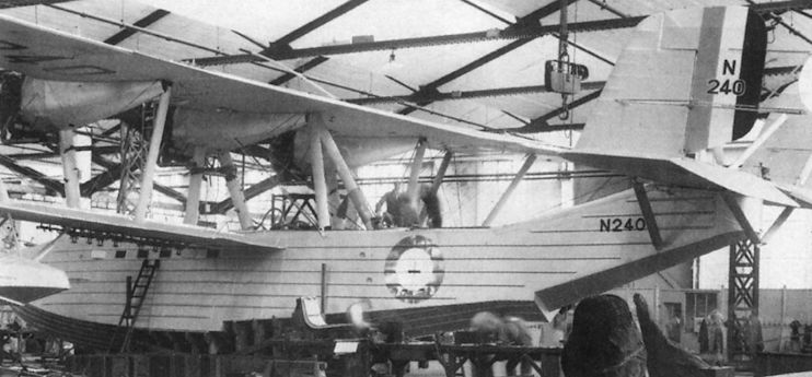 Регистрационный номер: N240 [9] N240 under maintenance or modification in the manufacturer’s East Cowes shed at an early stage in its development. It has the early unbalanced elevators and is fitted with underwing bomb racks. Note that its serial number is painted on the underside of the upper mainplane.