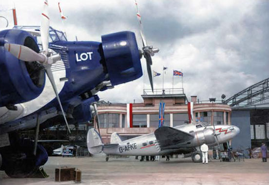 Регистрационный номер: G-AFKE Варшавский аэропорт Окенче летом 1938 г. На переднем плане слева Ju-52/3m авиакомпании «LOT», позади него - Локхид «Электра» английской «Бритиш Эруэйз».