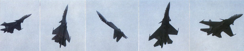Yevgeny Frolov’s demonstration of the Sukhoi Su-37 with thrust-vectoring nozzles included a complete somersault, a development of the original “cobra” manoeuvre. The canards fitted to this version may be seen in action in the sequence.
