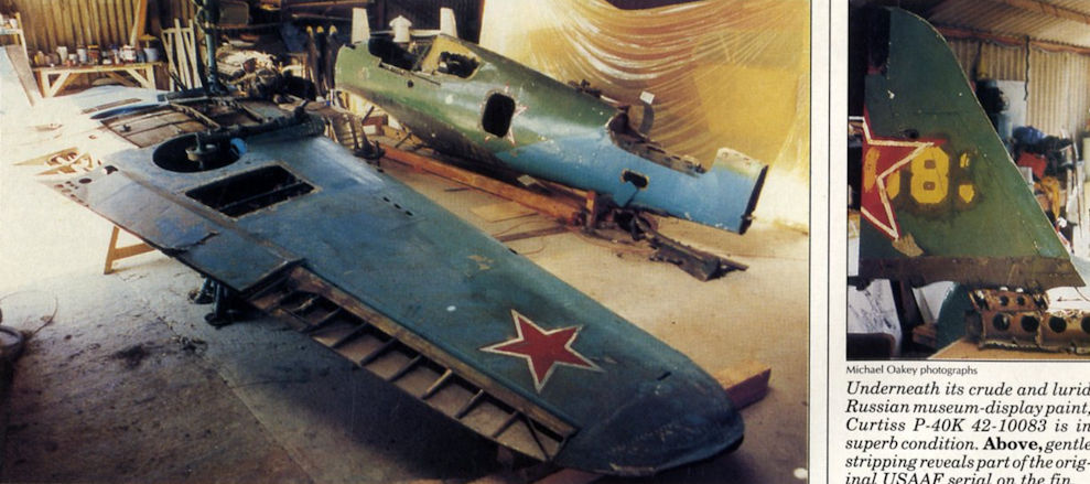 Underneath its crude and lurid Russian museum-display paint, Curtiss P-40K 42-10083 is in superb condition. Right, gentle stripping reveals part of the original USAAF serial on the fin.