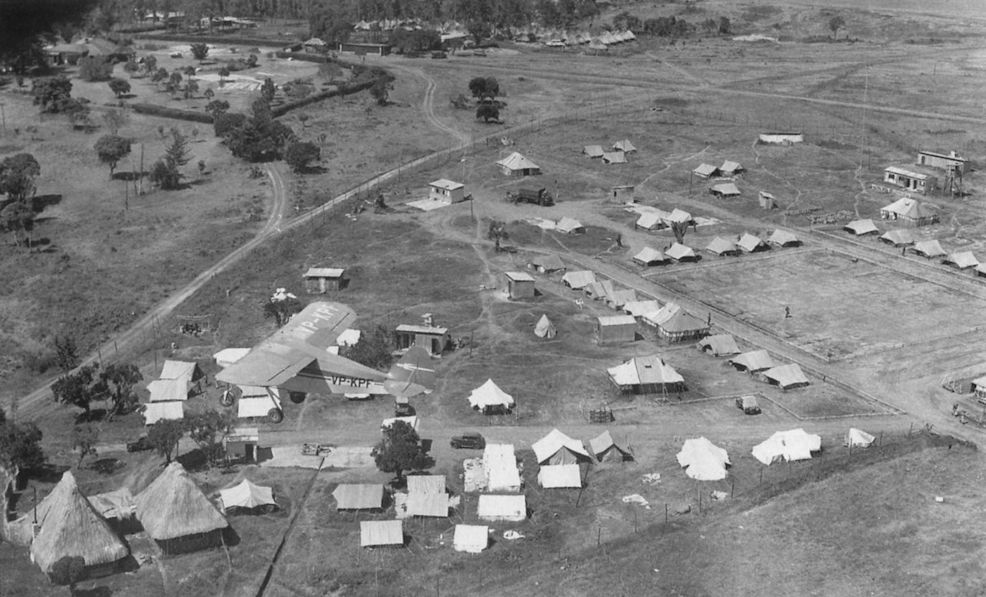 Регистрационный номер: VP-KPF [2] An aerial view of the KP Air Wing’s strip at Mweiga, which was guarded by a contingent of the King’s African Rifles, housed under canvas. Tri-Pacer VP-KPF is seen flying over the thatched mess-huts. The red earth strip was 1,200yd long.