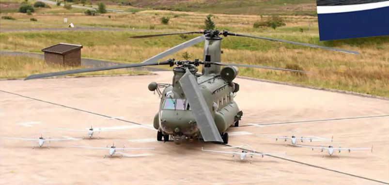 Six Callen Lenz Koios VTOL UAVs with an BAF Chinook during crewed-uncrewed (CUC-T) trials. The Koios UAV has removable wings and tail, allowing it to be rapidly deployed or disassembled and transported in two packing boxes. Once unpacked, it can be launched in less than ten minutes, making it a versatile asset for time-sensitive missions