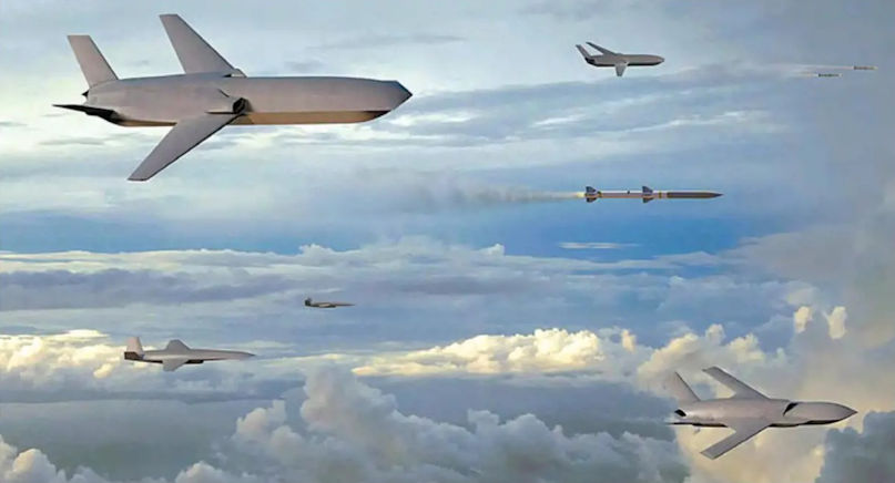 The Jackdaw is intended to be reusable but is cheap enough to be expendable if required. It is capable of a number of uses. Four are seen in this image, supporting an F-35 by acting as decoys and jammers