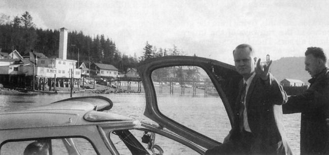 Setting off with a patient (already seated at rear) to be taken to hospital; Jack Pickup about to board his Seabee c. 1961. The building in the background is probably a salmon cannery.