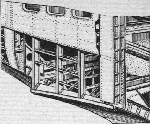Fuselage of the Whitley, at the junction with the wing. Farther aft there are no bracing members, and the longerons taper off. The skin is not attached to the frames but only to the stringers.