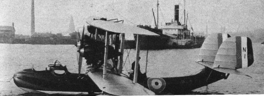The first "Supermarine." The P.B.1 was a biplane flying boat with 50 h.p. Gnome rotary engine driving a tractor airscrew. Note the grapnel in the bows.