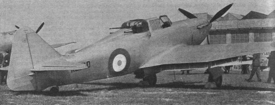 TURRET FIGHTER: The Boulton Paul Defiant two-seater fighter which mounts a four-gun "B.P." turret. This type has not yet been in action but should prove an extremely dangerous opponent to bombers.