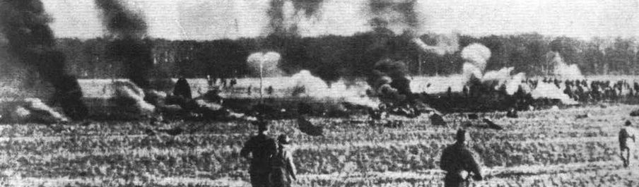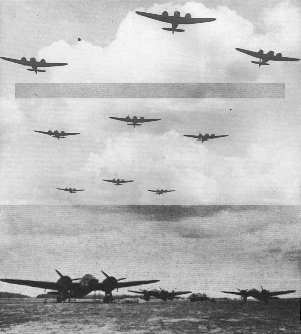 Another picture of Stavanger, with what appear to be two 500 lb. bombs going down. On the right are two Junkers Ju 52 transports, the remainder of the aircraft seem to be Junkers Ju 88 bombers. Two large bomb craters are visible near the 52s.