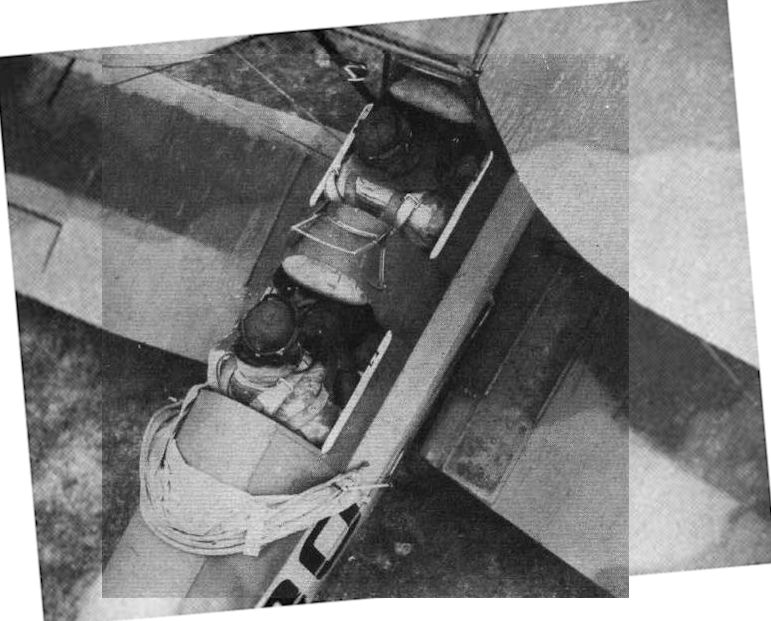 It will be seen in this overhead view that the cockpits of the Tiger Moth are grouped close together and that exit in emergency is easy. Note the blind-flying hood.
