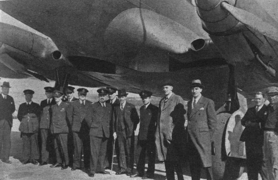 OUR END OF THE ATLANTIC SERVICE: Early next month will start a regular British service between London and Lisbon, linking there with the Pan American Atlantic. Recently an Albatross was flown to Lisbon experimentally, where it is seen at Sintra aerodrome with visitors and hosts. In the centre of the group is our Ambassador to Lisbon, Sir Walford Selby.