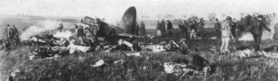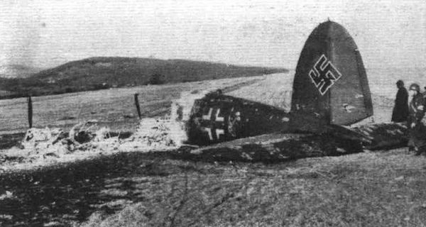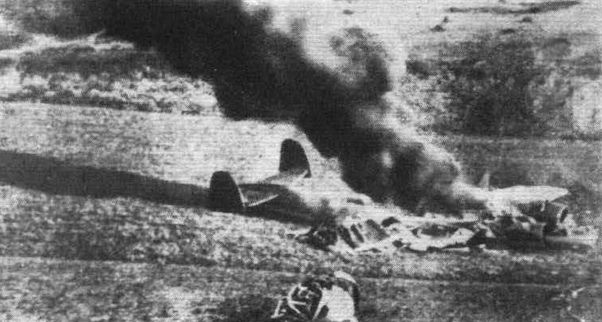 A Heinkel He 111 K brought down by French Curtiss fighters in the Meuse.