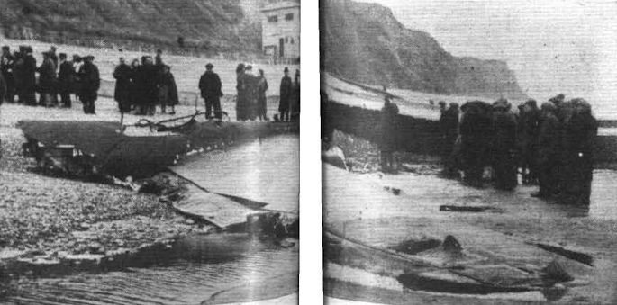 Looking like some great flat fish, part of a He 115 float-plane is washed up on the east coast