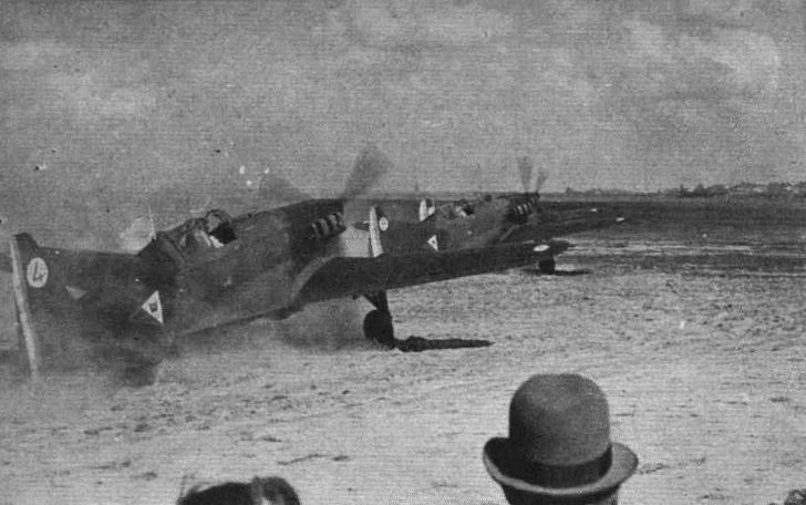 Visitors to the military flying display at Evere last year will recall the pretty show put up by three Moranes. Here they are taxiing in through the dust storm.