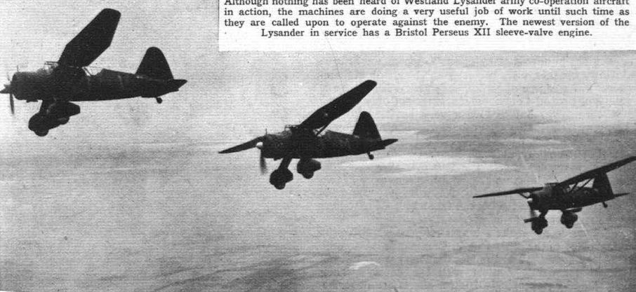 Although nothing has been heard of Westland Lysander army co-operation aircraft in action, the machines are doing a very useful job of work until such time as they are called upon to operate against the enemy. The newest version of the Lysander in service has a Bristol Perseus XII sleeve-valve engine.
