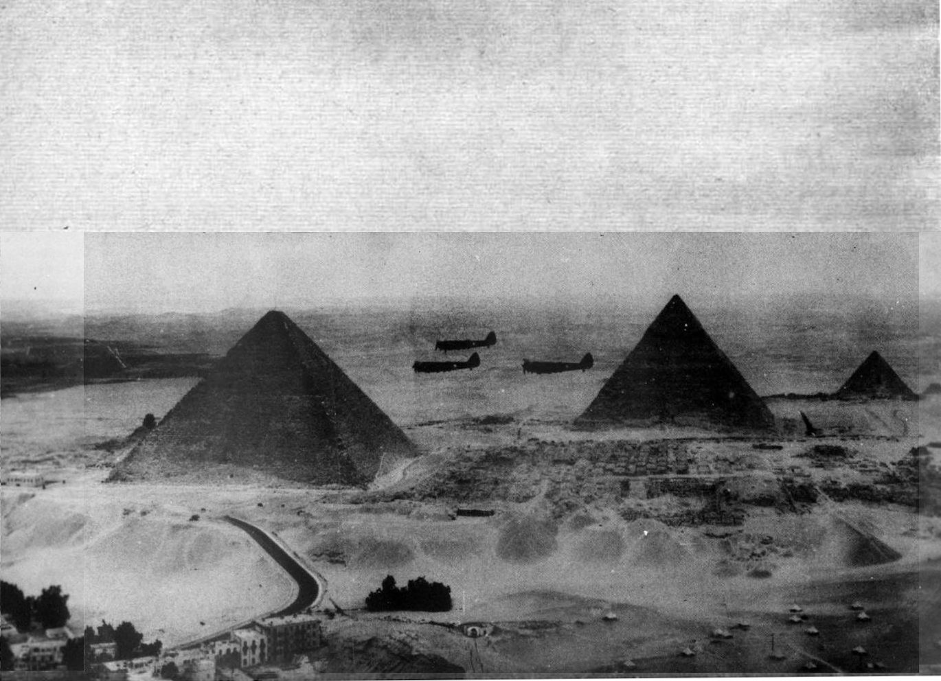 EGYPT TESTS HER DEFENCES. Massed flights took place over Cairo last week, the population being greatly impressed by Britain's air strength. Here are three Bristol Blenheims flying over the pyramids.