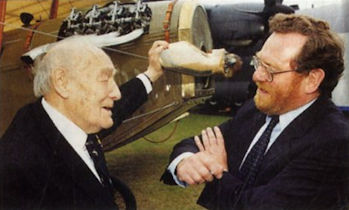 Philip Bristow, who trained on Curtiss Jennies in World War One, recounts some of his experiences to Permanent Under-Secretary of State for Defence John Speller in front of Vic Norman’s Jenny at Fairford.