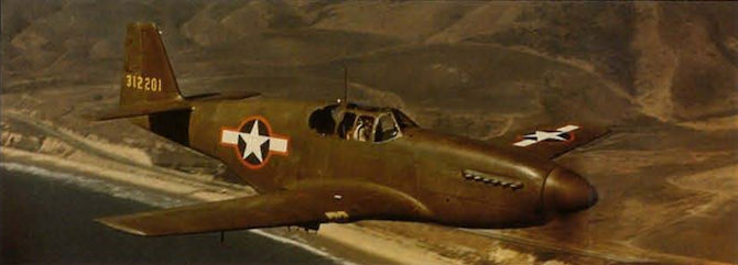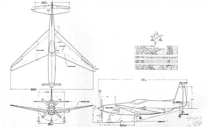 The shape of what might have been. In case the war continued, NAA had come up with a variation of the Mustang with a swept-forward wing, an advanced Allison V-12, a Westinghouse jet added to the rear fuselage and a tricycle undercarriage.