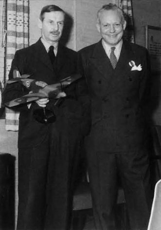 Sir Hugh Dowding holds a desk model of a Mustang I while visiting Dutch Kindelberger at the NAA factory during early 1941.