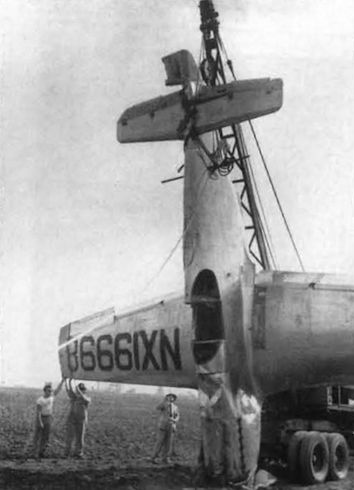 Регистрационный номер: NX19998 The bent and broken NA-73X prototype is recovered from a soya bean field near Mines Field after a flight-test crash. The aircraft was rebuilt and continued test work, but its eventual fate is unknown.