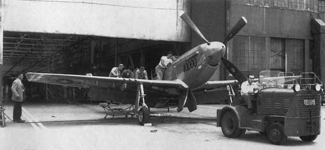 Mustang Mk Is (on the left) go down the first Mustang assembly line at Inglewood, in company with Harvards.
